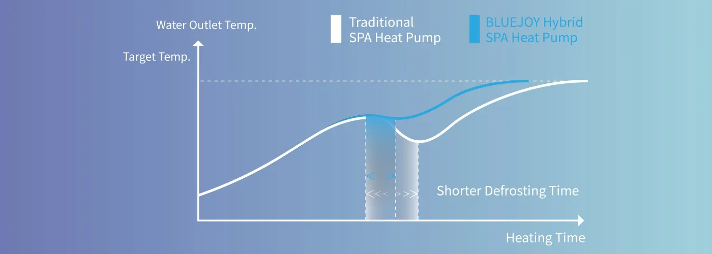 En comparación con las bombas de calor SPA tradicionales, las bombas de calor SPA híbridas BLUEJOY reserve los terminales de control para calentador eléctrico SPA. Al descongelar, el calentador eléctrico del SPA se encenderá para mantener el agua del SPA aún caliente. Mientras tanto, el período de descongelación será mucho más corto.